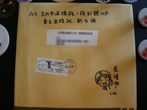 然後在昨天的中午吃過中餐本來想睡個午覺時,突然聽到樓下有人在叫我,又聽到摩托車的聲音,那八成是郵差了,便下去領取。在看到掛號信時,我頓時還疑惑了一下,我最近應該沒有多買東西了,那來的掛號信。一看之下看到寄件者是東立出版社時,我才發現我抽中了,領了回去之後連午覺都不想睡了,小心翼翼的用美工刀拆開。